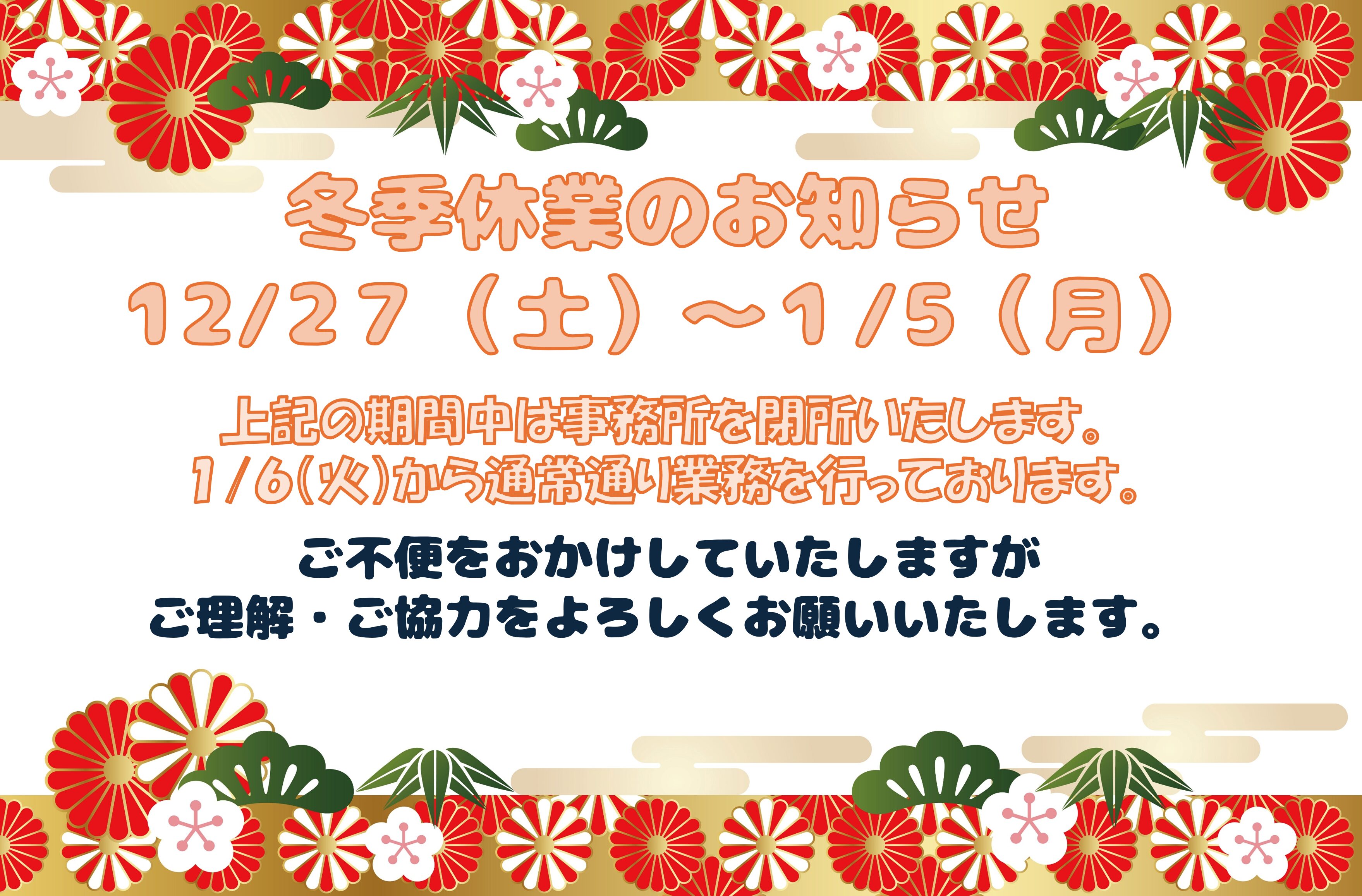 12月27日(土)から1月5日(月)まで冬季休業期間とさせていただきます。